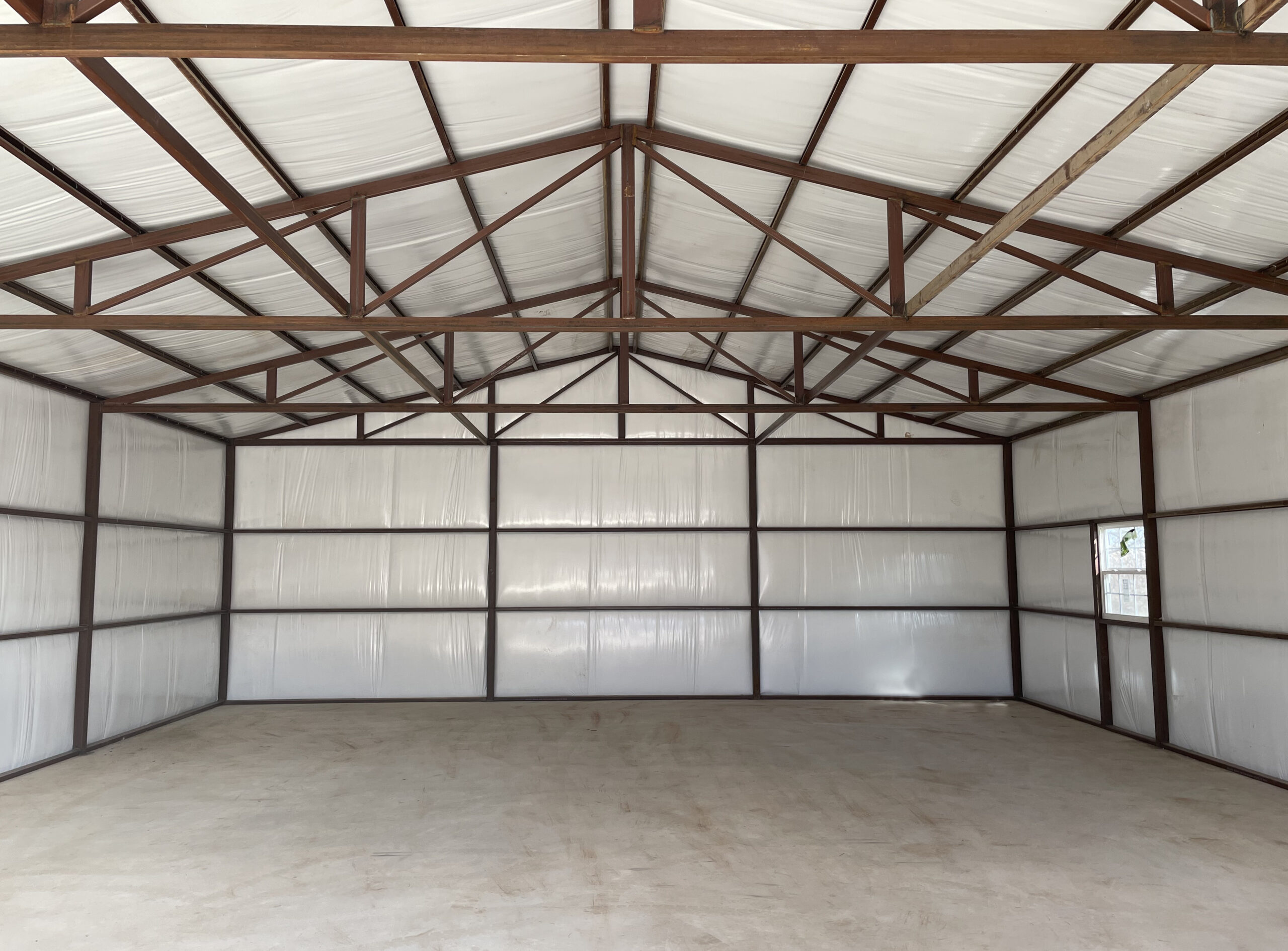 Provides a stronger frame than galvanized tube construction. More suitable for buildings that will be insulated and climate controlled. Our most popular style for barndos, workshops, and work spaces. Offers internal clear span widths up to 60′. Allows more design flexibility than galvanized tube construction. More options for doors, windows, insulation, and accessories are available.
